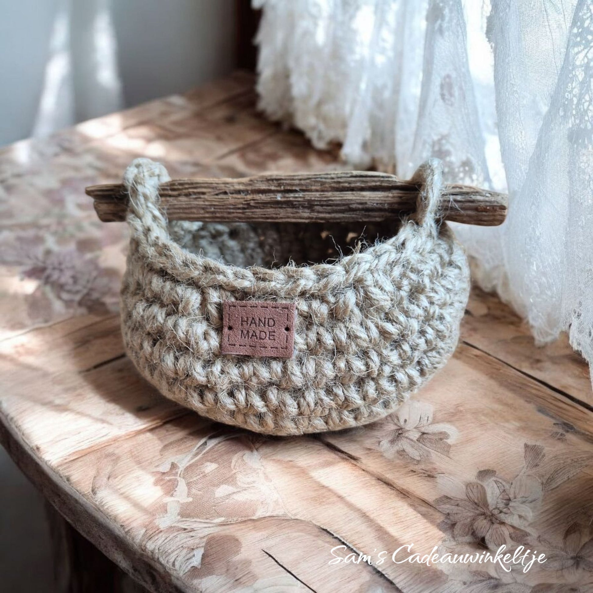 Deze handgemaakte jute mandjes. Elk mandje is uniek, met een speciaal stuk drijfhout dat persoonlijk op het strand is gejut. Ze zijn ideaal voor diverse doeleinden; ik gebruik ze bijvoorbeeld voor amberblokjes.Â