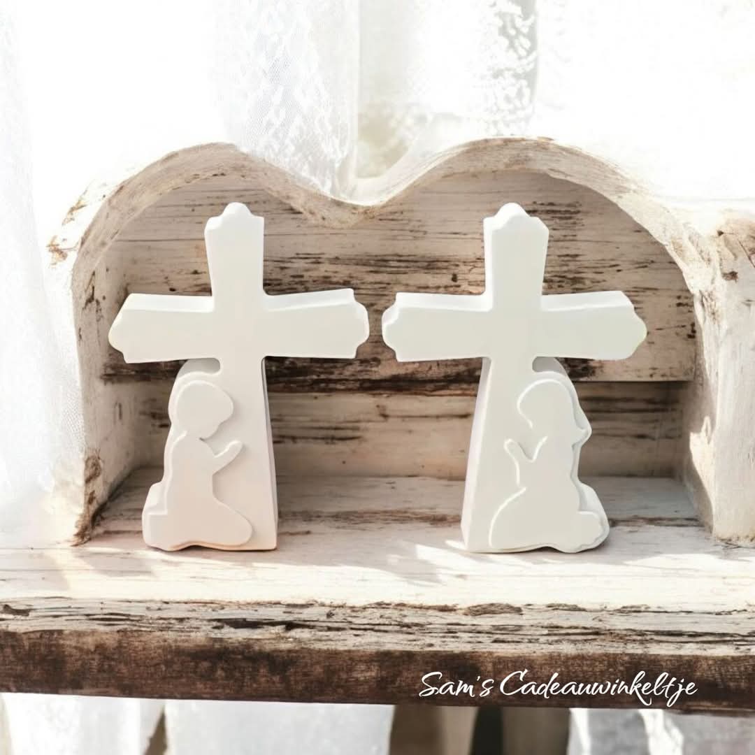 Een schattig, handgemaakt kruisje van porseleingips, perfect als doop-, communie- of kraamcadeautje. Verkrijgbaar in een variant voor een jongen of een meisje.